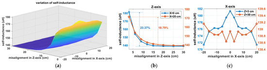Variation of self-inductance: (a) the overall diagram, (b) the variation trend along the Z-axis with different X-axis misalignment, and (c) the variation trend along the X-axis with different Z-axis misalignment.