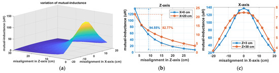 Figure 6a shows the global trend of mutual inductance variation and illustrates that the change of mutual inductance is more conspicuous than that of self-inductance and is positively correlated with coupler misalignment. Hence, the reduction in both Figure 6b,c is much larger than the parallels in Figure 5.