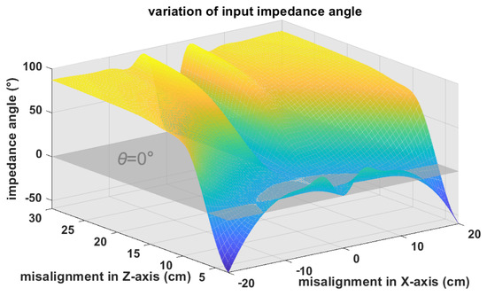 Figure 10 shows the calculation results of θin with different misalignment of the coupler. It is known that θin will vary between less than, equal to, and greater than 0 as misalignment varies. In particular, when the coupling is relatively tight (i.e., the distance along the Z-axis is short) and the coupler is greatly misaligned along the X-axis, θin will decrease below zero, which means that the input impedance is capacitive. The capacitive input impedance is highly unfavorable and can easily cause device damage and system shutdown. On the other side, when the coupler is misaligned along the X-axis with a long distance in the Z-axis, θin will increase above zero, even approaching 90°, and the input impedance will become inductive. At that time, the switching stress of the device and switching loss of the inverter will greatly increase, resulting in a higher risk of malfunction and depressed energy transmission efficiency.