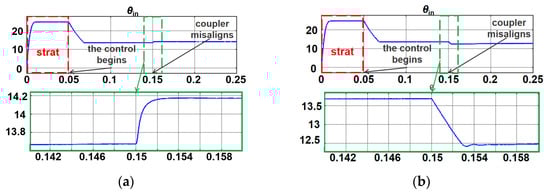 In the second simulation, the given range of θin is set as 10–15° as mentioned and the inductance is altered at 0.15 s. The waveform of θin during the simulation is plotted in Figure 16a,b severally. In Figure 15, θin immediately varies the inductance changes at 0.2 s and the control module takes effect at once, making it out to maintain θin within the given range.