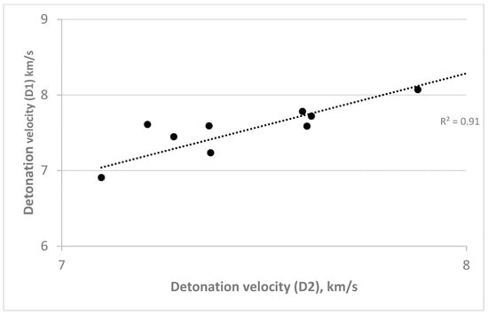 The relationship between the detonation velocity calculated by Equation (1) (D1) and Equation (2) (D2). The correlation coefficient R2 is equal to 0.91, indicating a strong relationship. Non-coincidences can be addressed by the deviations in the density and other parameter calculations.