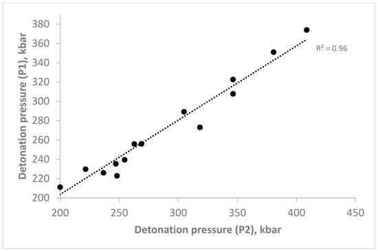The relationship between the detonation pressures when they are calculated by Equation (1) (P1) and Equation (2) (P2). The correlation coefficient R2 is equal to 0.96, indicating a strong relationship. Non-coincidences can be addressed by the deviations in calculations of the detonation velocity.