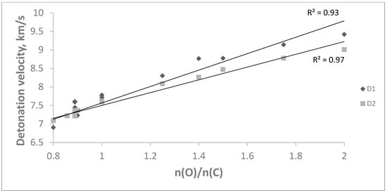 The relationship between the detonation velocity when calculated by Equation (1) (D1) and Equation (2) (D2) and the oxygen rate with respect to the carbon number in the compounds. The correlation coefficient R2 is equal to 0.93 and 0.97, indicating a strong relationship between the detonation velocity and the number of oxygen atoms with respect to carbon atoms.