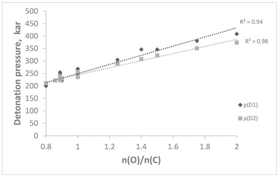 The relationship between the detonation pressure p(D1) and p(D2) when the detonation velocity is calculated by Equation (1) (D1) and Equation (2) (D2), respectively, and the oxygen rate with respect to the carbon number in the compounds. The correlation coefficient R2 is equal to 0.75 and 0.80, indicating a strong relationship between the detonation velocity and the number of oxygen atoms with respect to carbon atoms.