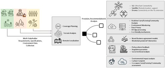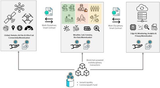 The ever-evolving economic and environmental landscape [,] has created a significant digital and business scale gap between corporate entities and smaller businesses and communities. This aspect is further amplified when the farm, forestry, community is also remotely located, far from the telco fast broadband backbone. Last-mile investments are always expensive and an insurmountable cost for the stakeholder to bear. The model proposes a multi-actor business to nourish and foster last-mile services-as-a-whole, while proposing budget friendly solutions, and novel data monetization [,]. Nowadays, small farmers, foresters, communities technically give away their data in exchange for limited analytic insights [,]. The concept acknowledges that especially remote farms, forestries and communities have vastly more unique data to offer, due to their location, and the atypical weather patterns they experience. This data possesses significant value for several stakeholders, either scientifically, or environmentally, or even financially. Therefore, the project proposes a decentralized mechanism to monetize this type of data and reinforce the market position of the farmers, foresters and rural communities.