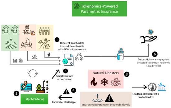 Financial independence and increase competitiveness for agricultural, forestry sectors and rural areas can be gained through a sustainable business model that not only increases profits and production but also protects them against outlier events and incidents. The proposed concept identifies asset protection and insurance as a crucial factor in the development of under privileged areas and communities and proposes a hybrid model of dynamic parametric insurance with the integration of tokenomics. Parametric insurance (sometimes referred to as index-based insurance) is a type of insurance that does not indemnify or compensate for the actual loss, but rather issues a fixed payment upon the occurrence(s) of an objective triggering event, contrary to the common indemnity insurance. Parametric insurance—or warranties as some like to refer to it—has been used to complement indemnity products as a ‘front stop’ to get payments out quickly to insureds before full loss assessments are obtained. Additionally, farmers, foresters and other rural sectors in developing communities often lack access to insurance because of the low margins for insurers. The project directly addresses this gap and proposes a novel approach which will further converge with the whole vision for a sustainable and circular Society 5.0. The overview of the proposed model is presented in Figure 4.