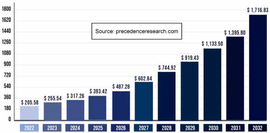 Electric vehicles (EVs) are gradually substituting conventional combustion engine (ICE) vehicles in several countries. According to Figure 1, the global EV market size in 2022 was approximately 206 billion USD [1]. It is estimated to exceed 1716 billion USD by 2032. For the period from 2023 to 2032, the forecasted compound annual growth rate (CAGR) is approximately 23% [1].