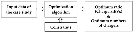 This case study attempts to find the optimum ratio between the number of public charging points and the number of electric vehicles. Consequently, the suitable number of EV chargers that should be installed in a certain province to secure the charging requirements of a specific number of EVs can be determined. No concrete or unique value can accomplish this task, not only because many variables and parameters affect the computation of this ratio, but also because some criteria can be set when computing this ratio. Some of these criteria are the minimization of cost, the minimization of charging time, or the optimization of both simultaneously. Accordingly, instead of a single (unique) solution, optimum scenarios can be achieved. This way, decision-makers can select the most convenient scenario among several alternatives. The conducted case study is assigned to the KSA market, as one of the emerging and promising markets in the Middle East. Figure 2 briefly demonstrates the main objective of the conducted case study.