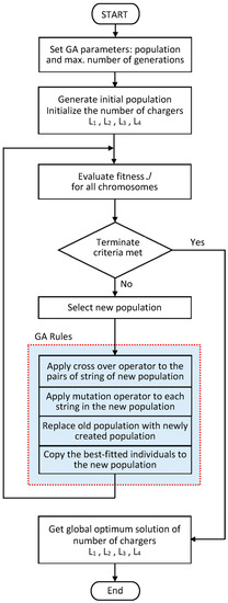 The GA is based on natural selection, borrowed from the evolution of biology [55,58]. The process of producing the next generation from the current population to obtain the global solution is composed of three main steps: selection, crossover and mutation. The selection rules select the individuals, called parents, that contribute to the next generation’s population. The crossover rules combine two parents to produce children for the next generation [55,59,60]. The GA modifies the population of individual solutions repeatedly. At each step, the GA selects individuals randomly from the current population to be parents. It uses them to produce children for the next generation [59,60]. The population evolves toward an optimal solution based on the best-fitted individuals’ fitness. The parameters of the employed GA are presented in Table 7, while the flowchart of the GA algorithm is shown in Figure 5 [55]. See Appendix B to recognize the main information of the simulation environment of the employed optimization software.