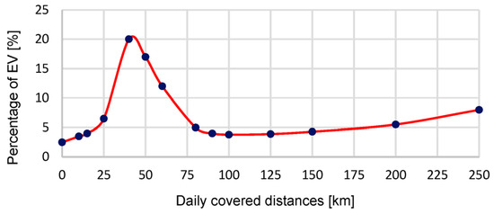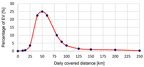 The estimated EVs’ daily utilization profile varies from one city to another and from one province to another [61,62,63,64]. Also, it varies from working days to weekends. The estimated daily travelled distances during working days and weekends are illustrated in Figure 6 and Figure 7, respectively. It is Gaussian distribution-like, where most people drive their EVs for distances between 25 km and 100 km.