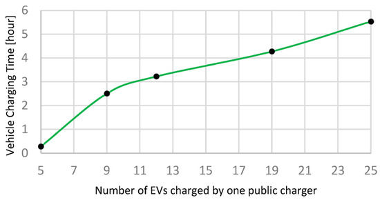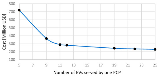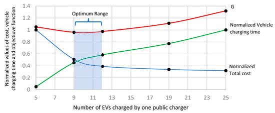 Similarly, the total charging time term of the objective function () is the sum of the total charging time of the individual type of chargers multiplied by the concerning weight factor, as described in Equations (7) and (8).