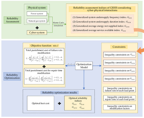 A reliability optimization method of GEIES considering cyber–physical interactions is proposed in this paper, including two critical processes of reliability assessment and reliability optimization, as shown in Figure 1.