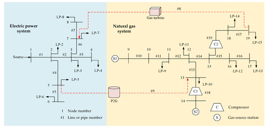 In this paper, the GEIES coupled an 8-bus distribution network system with the 11-bus natural gas system, and the system structure is shown in Figure 3. The system included 8 gas transmission pipelines, 2 gas-driven compressor branches, 2 gas source stations, 7 gas load points, 8 electric load points and 7 distribution lines. Gas load point 19 was connected to electric load point 7 through a gas turbine, and gas load point 13 was connected to electric load point 5 through a P2G. The rated power of the gas turbine was 0.8 MW, and the rated power of the P2G was 1 MW.