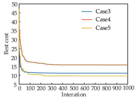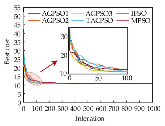 The purpose of this section is to provide a comprehensive comparison of multiple particle swarm optimization algorithms to highlight the superiority and applicability of the AGPSO2 algorithm adopted in this paper in GEIES. Therefore, the AGPSO2 algorithm proposed in Reference [17] was used in this paper to optimize the solution, which was compared with two other versions of the AGPSO algorithm as well as other improved particle swarm optimization algorithms. The specific description of each algorithm is referred to in Reference [17]. The number of particle populations was set to 100, and the number of iterations was set to 1000. The variation curve of the optimal cost for each algorithm is shown in Figure 4. In order to compare the applicability of each algorithm for the GEIES solution more precisely, each algorithm was operated 50 times separately, and the results of the operation were statistically analyzed to obtain the maximum, minimum, mean and standard deviation of the optimal cost, as shown in Table 8.