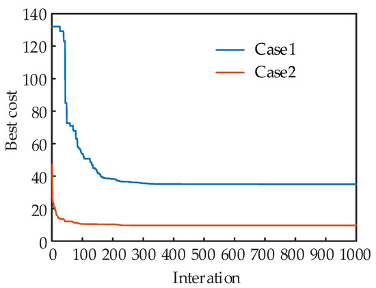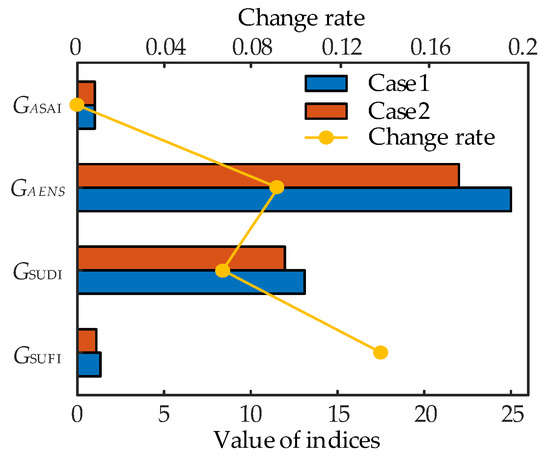 In Figure 5, the curve of the optimal cost of Case 2 converged faster than that of Case 1, with the final optimal cost obtained having a substantial decrease compared to that of Case 1. As shown in Figure 6, after considering the impact of the cyber system, the three indices , and decreased by 18.17%, 8.68% and 12.00%, respectively, all having a significant decrease, and the generalized average service available index slightly improved. This is due to the fact that the information system provides real-time monitoring of the line operation status and performance indicators, which enables timely detection of line faults or abnormalities, a reduction in the scope of impact caused by faults and a reduction in the failure rate. At the same time, the cyber system can provide a fault diagnosis function to locate fault points quickly and accurately by collecting and analyzing data, shortening the time for fault troubleshooting. This helps to quickly restore the normal operation of the line and reduces the average repair time. Furthermore, the cost of the objective function was reduced by over 70% after considering the cyber system, which significantly improved the economy of the system.