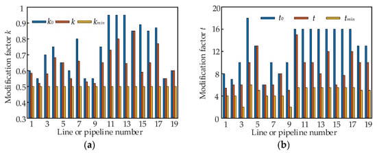 Modification factors in the results of reliability optimization: (a) Modification factor ; (b) Modification factor .