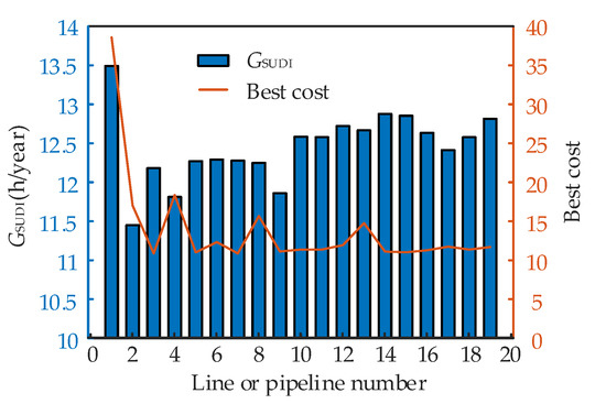 To analyze the impact of cyber-attacks on system reliability optimization, cyber-attacks were applied to information components connected to each line or pipeline separately to research their impact on GEIES reliability optimization. The reliability optimization results are shown in Figure 10.