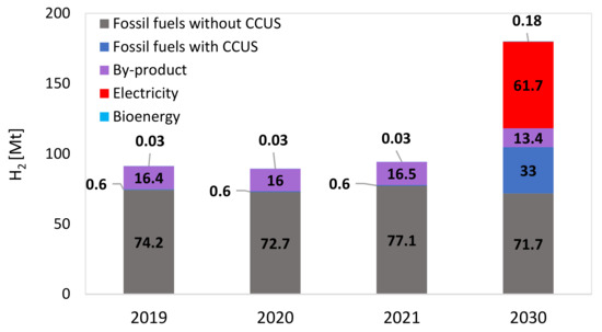 Over the last decades, hydrogen has been produced mainly for industrial applications through conventional production processes based on fossil fuels. Global warming, increasing energy demand, and energy storage challenge made hydrogen a potential solution for future energy transition scenarios. Therefore, on the one hand, a significant amount of hydrogen should be produced to satisfy the growing market demand. On the other hand, these production methods should meet economic and environmental needs. According to hydrogen production data available from International Energy Agency (IEA) [1], in 2021, less than 1% of the produced hydrogen can be considered low-carbon. Low-carbon hydrogen refers to the hydrogen obtained through technologies with a low climate profile, specifically, low CO2 equivalent emissions. Figure 1, based on the IEA predictions, shows the current and future status of hydrogen production from different sources. Around 94 Mt of H2 was produced in 2021, of which more than 80% has been obtained directly from fossil fuels without the application of carbon capture, utilization, and storage (CCUS). Currently, the chemical sector demands the largest share of hydrogen in the market to produce ammonia (36%) and for hydrocracking and desulfurization of fuels in refineries (42%) [2]. Based on a net-zero emissions (NZE) scenario, it is forecasted that in 2030, hydrogen production will reach up to 180 Mt. Production via the application of electricity (34%), and fossil fuels with CCUS (18%) will be responsible for this increase in supply. The corresponding demand for this increase in the production volume comes from new applications (heavy industry, power generation, and synthesis of H2-based fuels) [1].