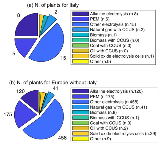 Figure 2. Number of H2 projects based on different processes for (a) Italy and (b) Europe without Italy, built based on the raw data from IEA [3].