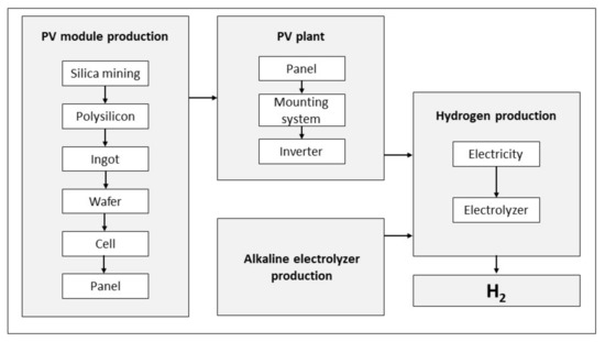 In this section, the methodology adopted to implement the research is described, providing: (i) a description of the different hydrogen production technologies via water electrolysis, (ii) the electricity source (i.e., photovoltaic), and (iii) the process-based life-cycle assessment method. The articles selected for the literature review are identified using the Scopus database by searching the words “hydrogen” and “life cycle”. The search result is refined by the words “photovoltaic (PV)” and “electrolysis”. Since the present paper aims to review and analyze the impact of PV panels on hydrogen produced via electrolysis, only the publications reporting at least the carbon footprint of this specific hydrogen production approach are included. In other words, the literature in which extracting the GWP impact of PV-based H2 via electrolysis is not possible is excluded.