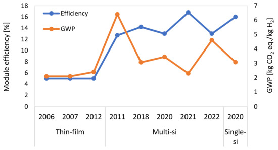 In 2004, Koroneos et al. [53] estimated a value of around 6.2 kg CO2 eq. per each kg of liquefied hydrogen produced from PV-based electrolysis. Their comparative assessment of the various H2 production methods was based on the Global Emission Model for Integrated Systems (GEMIS) database [54]. They reported that PV-based hydrogen shows the worst environmental performance compared to other production routes due to the high contribution of the PV module manufacturing process. The paper does not provide enough information on related assumptions like the size of the PV system, the capacity of the electrolyzer, etc. It can be guessed that the location of the PV system was considered to be in Germany due to the use of a German database.