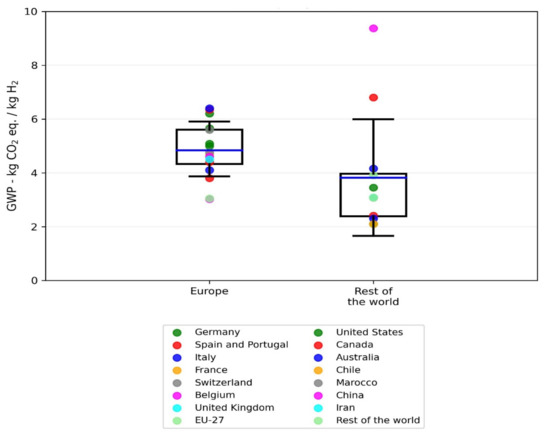 85. Vilbergsson, K.V.; Dillman, K.; Emami, N.; Ásbjörnsson, E.J.; Heinonen, J.; Finger, D.C. Can Remote Green Hydrogen Production Play a Key Role in Decarbonizing Europe in the Future? A Cradle-to-Gate LCA of Hydrogen Production in Austria, Belgium, and Iceland. Int. J. Hydrogen Energy 2023, 48, 17711–17728. [Google Scholar] [CrossRef]