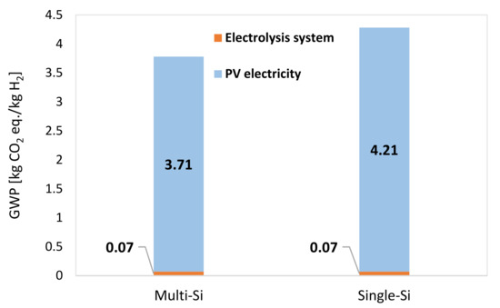 In 2017, Zhang et al. [70] published an LCA study of power-to-gas technologies, including PV-based H2, using both alkaline and PEM electrolyzers. The production site was set to Switzerland, and the background data were extracted from ecoinvent 3.1. They calculated GWP values equal to 5.59 and 4.76 kg CO2 eq./kg H2 for alkaline and PEM electrolysis systems, respectively. The slightly better environmental performance of the PEM electrolysis system was obtained due to its higher average efficiency. Ozawa et al. [71] assessed the GHG emission of hydrogen supply chains to be used in FCVs in Japan. One of the renewable H2 supply chains considers the production of hydrogen via electrolysis powered by Australian solar PV. They used the Japanese Inventory Database for Environmental Analysis (IDEA) [72] as the background library, in which the GHG emission data were modified to present the Australian PV-based H2 production. Based on the mean value of specific alkaline and PEM electricity consumption from other studies, they calculated a GWP value equal to 4.16 kg CO2 eq./kg H2 for renewable hydrogen production (the rest of the supply chain is excluded). The first detailed LCA study on hydrogen production powered by PV was published by Rivera et al. [73] in 2018. They assessed the environmental impacts of a PEM electrolysis system that provides hydrogen as a cooking fuel in developing countries. Their analysis was based on ecoinvent 3.1 and resulted in a GWP equal to 3 kg CO2 eq./kg H2. It is reported that 90% of the GWP value is caused by the production of PV panels and their associated components in China. Their PV system includes ground-mounted multi-Si panels with an efficiency of 14.2% in an area with a solar global horizontal irradiance (GHI) equal to 2000 kWh/m2 per year.