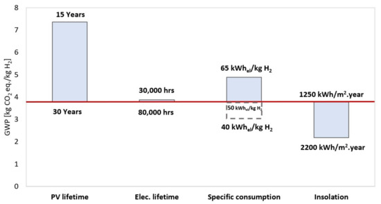 In 2013, Pereira and Coelho [64] performed an LCA of hydrogen for fuel cell vehicles (FCV) in Portugal. They found a GHG emission equal to 6.35 kg CO2 eq./kg H2 for gaseous hydrogen produced via PV-powered electrolysis using the GREET [65] and GEMIS models. The PV system is responsible for 56% of this emission. However, no further details on the hydrogen production system are provided within the work. In 2015, Reiter and Lindorfer [66], using GaBi software [67], assessed the GWP of power-to-gas technologies, including H2 production from PV. Their production system was considered in EU-27 and resulted in a 3.05 kg CO2 eq./kg H2 as the GWP value. Later in that year, Suleman et al. [68] calculated the environmental impacts of H2 produced using different electrolytic cells. They reported a GWP value equal to only 0.37 kg CO2 eq./kg H2 for the Na-Cl electrolysis system powered by PV. Life cycle inventory for chemicals from the ecoinvent database [69] was used for the electrolysis systems. These electrolytic cells co-produce chlorine and caustic soda in addition to H2. Depending on the adopted allocation approach (for example, mass-based), they can result in a very low amount of electricity demand to produce 1 kg of hydrogen. The allocation method is not mentioned in their work, where the very low obtained GWP value can be confusing to the reader.