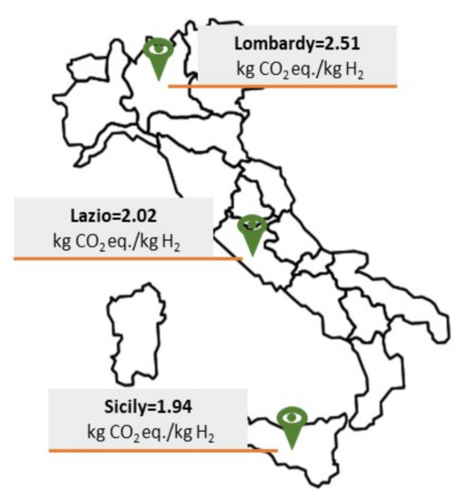Both single- and multi-Si panels with higher efficiencies are considered in the updated scenario. The annual specific yield of PV systems, which defines the amount of electricity produced for each kWp of PV module over a year, is updated for Italy according to Frischknecht et a. [48]. Also, in order to have a more realistic approach, the annual specific yield is calculated based on the real net PV electricity production data. Values were collected from Terna—the Italian electricity transmission operator [50]. The annual specific yield is estimated based on the published data for installed capacity and net production of PV systems over the three-year period of 2019–2021. This value is calculated for Italy and the three regions of Lombardy, Lazio, and Sicily as representative of the country’s north, center, and south, respectively. The related values used in the updated scenario are reported in Table 3. The assumptions corresponding to the electrolyzer remain unchanged.