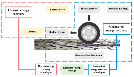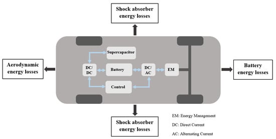 In an electric vehicle, energy is stored in the battery, which functions as the vehicle’s primary power source (Figure 2). The battery is used to power the electric motor, which drives the wheels and propels the car forward [15]. However, some of the energy stored in the battery is dissipated or lost in various sections of the vehicle due to thermal or vibrational causes. These losses can be collected and recycled as alternative energy sources, increasing the total efficiency of the electric vehicle. The interaction between the ground and the wheel, the braking system, the shock absorber, the electric motor and battery, and the aerodynamic drag are all possible sources for energy recovery. These energy sources are depicted in a diagram that illustrates the flow of energy from the battery used in an electric car. The aim of energy recovery is to convert these losses into usable energy that can then be reused to power the vehicle or stored in the battery for later use.