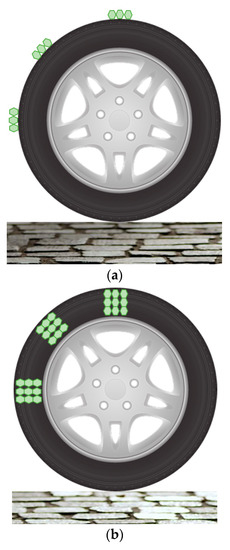 The triboelectric nanogenerator (TENG) is a cutting-edge energy harvesting device that converts mechanical energy into electricity by harnessing the power by the triboelectric effect. This concept is based on the interaction of two materials with opposing electrostatic properties. TENGs have received a lot of attention due to their ability to gather energy from a variety of sources including human motion and environmental energy. TENGs have been suggested for use in a variety of applications, including wearable devices, sensors, and energy harvesting systems [66,90]. In the automotive sector, studies such as [17,66] investigated the use of TENGs to recover energy from wheel rotation. These plans differ in structure, design, and location, with some TENGs placed inside the wheel and others on the outside of it, as illustrated in Figure 5.