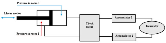 A regenerative shock absorber is a form of shock absorber that converts energy from vehicle oscillation into electrical energy. This mechanism converts mechanical energy from the suspension system into electrical energy via a generator, such as a linear alternator. The recovered energy can then be used to power different vehicle systems or be stored in a battery. To increase the energy efficiency of electric vehicles, researchers have suggested using regenerative shock absorbers. Vehicle suspension vibrations can be used to recover energy. The waste energy recovery potential of typical passenger vehicle suspensions ranges from 100 W to 400 W, indicating a large potential for energy recovery. This potential is proportional to the intensity of the vibrations, with stronger vibrations implying a higher potential [14]. Regenerative shock absorber systems come in a variety of configurations and include hydraulic and mechanical systems. A mechanical–electromagnetic–hydraulic coupling system is one suggested system, and includes components such as a hydraulic cylinder, non-return valve, accumulator, hydraulic motor, generator, and pipeline [71]. The system operates by converting external excitation energy into electrical energy via an energy conversion mechanism. When the pistons of the hydraulic cylinder are driven toward each other by external excitation, the oil flows through the valve system for rectification and then through the accumulator to weaken the fluctuations. This results in a constant flow of oil to drive the hydraulic motor and generate electricity (Figure 6) [71].