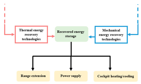 Energy recovery is the conversion of energy losses that occur at different stages in systems powered by an energy source into the form of energy that is available through specially designed devices and can be reused when required [91]. The recovered energy can then be used to increase range, charge various electrical devices such as sensors/instruments, or serve as an alternative heat source in the cockpit (Figure 8). The following are some typical applications for recovered energy:
