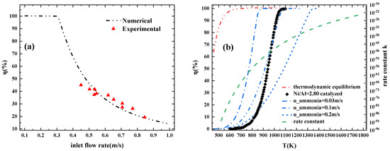 Figure 2b compares the simulation results of the model presented in this paper with previous studies, including experimental data and numerical simulations. Using a catalyst with a nickel–aluminum atomic ratio of 2.8 [19,25], the theoretical limit of the NH3 decomposition rate based on thermodynamic equilibrium is the red dotted line. The theoretical limit of thermodynamic equilibrium shows that a cracking rate greater than 50% can be achieved at a reaction temperature lower than 500 K. Sorensen et al. reported that using Ru as a catalyst and cesium (Cs) as a promoter, high NH3 decomposition efficiency can be achieved at a reaction temperature of approximately 500 K [26]. The green curve describes the change trend of the rate constant with the reaction temperature; as shown in the Formula (6), the ammonia decomposition rate under the same pressure is directly proportional to the rate constant. The blue dot line describes the simulation results from the model presented in this paper. When the ammonia flow rate is 0.03 m/s, the cracker shows a temperature sensitivity similar to that of the catalytic experiment. In the range of 700–800 K, the cracking rate varies with temperature and the change trend of is almost a vertical curve. The difference in cracking rate corresponding to temperature may be attributed to the use of different catalysts. Ammonia cracking sensitivity to temperature weakens with the increase of the ammonia flow rate, which is because the residence time of ammonia in the cracking tube becomes shorter, resulting in an inefficient heat exchange with the heating tube. When we compare the simulation results with the experimental results, our error is small. In addition, the results of the comparison with the research show a similar trend, which proves that this simulation model has certain reliability.