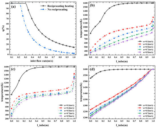 (a) η at reciprocating and non-reciprocating heating. (b) Temperature of the cracker ports with no reciprocating heating and (c) temperature of the cracker ports with reciprocating heating. (d) Temperature of the heating pipe (reciprocating heating) (u refers to different inlet ammonia flow rates).