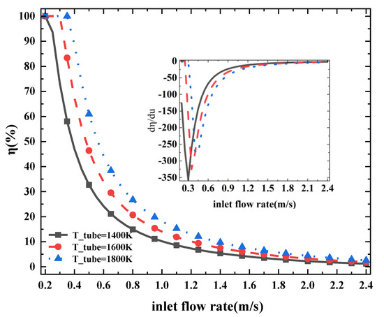 Figure 5 shows the variation trend of ammonia decomposition rate with ammonia flow rates in a counter-flow reactor at different heat pipe temperatures of 1400 K, 1600 K and 1800 K. The inset figure at the top right of Figure 3a is the one-dimensional derivative of the variation curve. The trend of the pyrolysis rate at different temperatures is very close to that of the ammonia flow rate. The magnitude of the decrease rate shown in the inset of Figure 5 dramatically increases first and then decreases to near zero because the increase in ammonia flow rate increases convection heat exchange efficiency between the ammonia and the catalytic bed but decreases the reaction time.