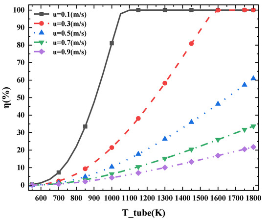 Figure 6 shows different ammonia-cracking rates corresponding to different heating tube flow rates under different ammonia flow rates ranging from 0.1 m/s to 0.9 m/s. The ammonia-cracking rate increases with the combustion gas flow rate in the heat pipe because higher flow rate in the heating pipe corresponds to higher heat exchange efficiency. The ammonia in the cracking pipe can be heated to a higher temperature, which corresponds to a more adequate reaction degree. It is worth noting that when the flow rate of the heating pipe is low, the rising rate is higher. For example, when the combustion gas flow rate increases from 0.25 m/s to 0.5 m/s, the ammonia-cracking rate varies from 20% to 30%, while when the flow rate rises to 0.75 m/s, the cracking rate only rises by 5%.