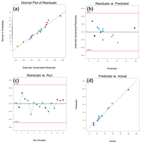 Figure 8 shows the model diagnosis of response variable R. The normal graph of residual should be approximately a straight line, and the relationship between residual and predicted response value and operation value should be random scattered points. The points in the actual response value graph with reference to the predicted response value are accurately arranged at an angle of 45° along the axis.