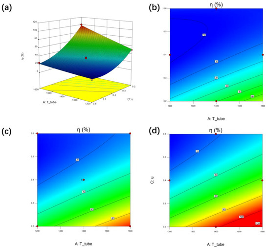 As shown in Table 5, the interaction term AC of the inlet temperature (A) of the heating intermediate pipe and the inlet flow rate (C) of the catalytic bed, and the interaction term BC of the inlet flow rate (B) of the heating intermediate pipe and the inlet flow rate (C) of the catalytic bed are related to the response factor (η). This interaction has high significance. The response surface of pipe flow rate of AC and η at different temperatures is shown in the figure.