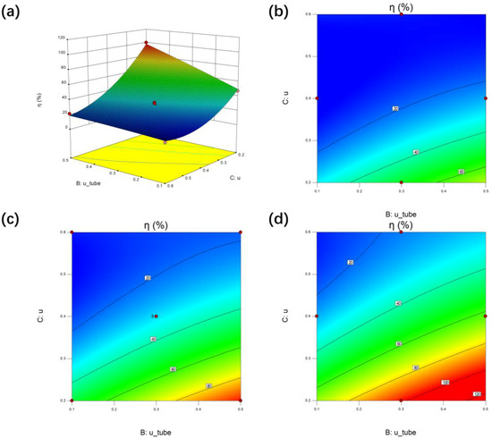 Interaction effect between the catalytic flow rate (C) and the heat tube flow rate (B) at fixed value of temperature of heat tube (A) on η of the ammonia cracker (R) by response surface and contour plot. (a) Response surface while A = 1400 K, (b) contour plot while A = 1200 K, (c) contour plot while A = 1400 K, (d) contour plot while A = 1600 K.