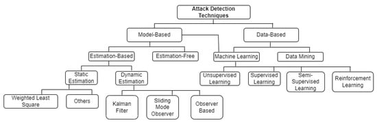 Various techniques for detecting and mitigating cyber-attacks have been reported. Existing detection techniques may be categorized broadly as model-based detection or data-driven detection schemes, as illustrated in Figure 1. On the basis where state estimation is used in the detection process, model-based detection techniques may be divided into estimation-based and estimation-free approaches. In this section, the various model-based detection approaches are reviewed.