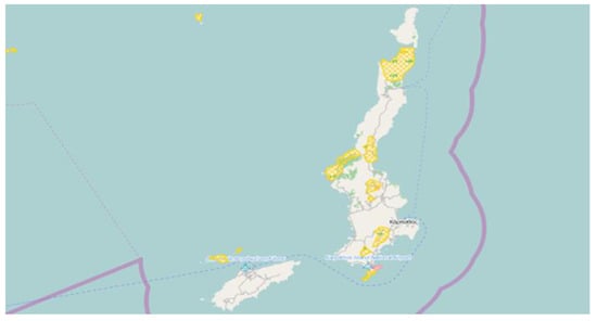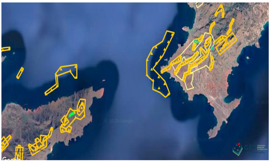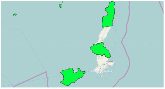In Figure 6, the red areas are some of the most significant places for birds in Greece. The whole of Kassos and of the northern part of Karpathos are highlighted. These sites are of vital importance for the maintenance of vulnerable birds and those threatened with extinction. In addition, in Figure 7, the yellow areas denote wildlife refuges (seven in number), and Figure 8 shows “Natura 2000” sites in green, in Kassos and Karpathos.