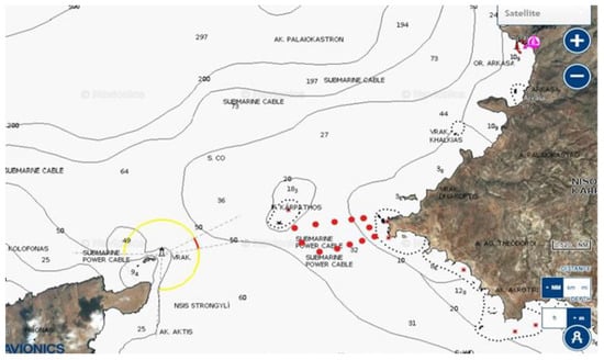 The area selected by the authors for the development of an OWF between Karpathos and Kassos is marked by red dots, in the southwest of Karpathos. Source: sailingheaven.com/, accessed on 11 February 2023, edited by the authors.