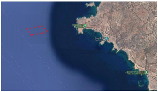 The authors decided that the most suitable location for the installation of an OWF in this area was that selected by the Ministry in 2010, i.e., to the southwest of Karpathos, in a location with an average water depth of 32 m (the average water depth for OWF installations in Europe was 33 m at the end of 2019 [31]) and a depth of 10 m at certain points. This location is opposite the Saints Thedoroi area. The exact site for this OWF project is marked by red dots in Figure 4.