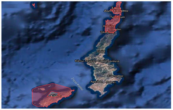Some of the most significant areas for birds in Greece are located on Kassos and Karpathos, as shown in red. Source: Ornithological—HellenicOrnithologicalSociety (accessed on 6 February 2023).