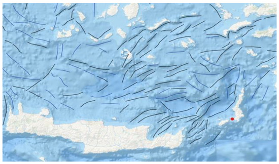 The tectonic lines in Greece. The red dot denotes the location examined for this project. Source: ec.europa.eu/maritimeaffairs/atlas/maritime_atlas/, accessed on 11 February 2023, edited by the authors.