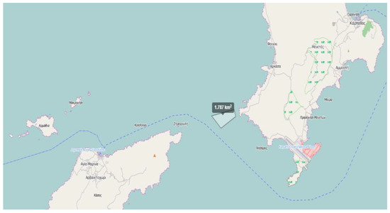 The polygon designed by the authors for the OWF in this project is visible in the southwest of Karpathos. Source: geodata.gov.gr/, accessed on 11 February 2023, edited by the authors.