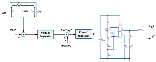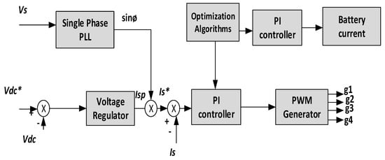 This study used a power flow control bidirectional boost converter [,] to charge/discharge a battery store. The control was based on whether the battery needs to be charged/discharged according to the availability of SPV power and water demand. The battery produced power during the day. On the other hand, when there was SPV power, the battery is charged. When all the power required for the water pump was supplied from the SPV array, pumping water was necessary, and the battery was non-functional. The proposed system functioned as a charging source for the battery; an SPV array and an external power source were not required. In this case, the full benefit was obtained from both the motor pump system and the PV installation. The bidirectional power flow provided bidirectional power flow through a collective capacitor placed on the DC bus of the voltage source inverter (VSI). The DC link voltage of the VSI was regulated so that the BLDC motor speed was kept at a nominal value. However, with the gain constants obtained with the traditional proportional integral (PI) controller, full-rated control could not be achieved; it was kept at the full nominal value by adding the optimization algorithm and was also kept at the constant value by applying optimization to the PI controller where the current battery value was controlled, as well as the PI controller where the DC-link voltage was also controlled at the same time. This application allows water to be pumped at full capacity [].