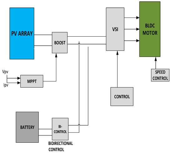 A brushless DC motor (BLDC) driver for solar photovoltaic (SPV)-powered water pumping has recently gained more attention as it is highly efficient, easy to maintain and drive, and compact [,]. Due to its intermittent nature, SPV power causes unreliable and intermittent water pumping; bad climatic conditions and the absence of sunlight cause the entire water pumping system to shut down. In addition, PV installation and other resources are not used where water pumping is not required. If full water distribution is desired continuously due to these troublesome situations, external power support is required. In remote locations, a diesel generator is often used as a backup supply [,]. Recently however, it has been recommended that diesel generators should not be used, to maintain a pollution-free environment and reduce threats to energy security. Thus, the only solution left as a power backup is to use battery storage. A battery-powered SPV hybrid power supply provides enough power for a reliable water pumping system [].