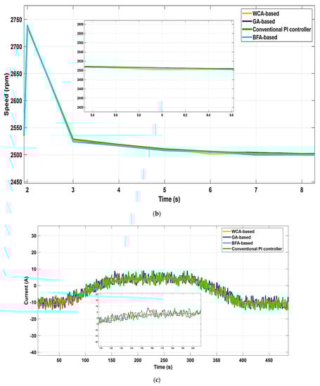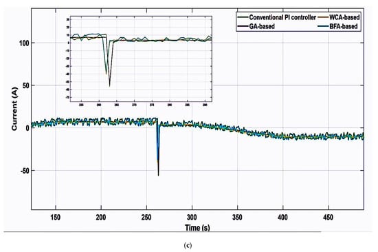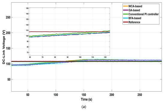 The proposed hybrid water pumping system was modeled and optimized, and the performance analysis performed, using MATLAB/Simulink toolboxes. A hybrid generation unit consisting of a 1.92 kW peak power and a 72 V SPV array was used, with a 300 Ah lead-acid battery feeding the 110 V 5.2 Nm BLDC motor pump at 3000 rpm. The GA, BFA, and WCA optimization algorithms were applied to utilize the ISE, ITSE, IAE, and ITAE; the iteration number was 100. The optimization process was conducted on a computer with an AMD Ryzen 7 4800 H processor with Radeon Graphics 2.90 GHz. The parameters obtained as a result of the optimization are given in Table 7. When evaluated in terms of average error detection criteria, the performance of the WCA was more effective than the GA or BFA and provided more effective picking and control. It was also effective as determined by the results of all the performance criteria. In the first case, the SPV-battery water pump system was run at a fixed 2500 rpm rotor speed. The aim was to determine the control performance by applying each algorithm method during the transitions. The control monitored the defined references for the DC-link voltage and battery current. Figure 6 shows the results of the tracking responses. Examining the results of the WCA method, while it was over-damped at the preferred settling time, the voltage responses of the GA and BFA-based PI control were underdamped, with a certain overshoot—as shown in Figure 6a. As a result of the dynamic analyses performed in Simulink in Figure 6a, in Table 8, while the over-shoot value was 8.9 in the DC-link voltage control provided with the PI constants—determined by the conventional method under constant speed—the overshoot value was 1.27 when the PI parameters were obtained using the WCA optimization algorithm. When the settling time was examined, it was reduced to 151.08 with the WCA-based method, while it was 160.5 in the conventional method. The WCA method had the best settling time, following the reference value for speed control in Figure 6b. In Figure 6c, it is seen that fluctuations were high in the conventional method and GA technique in terms of current control; these fluctuations were reduced with a good optimization tool such as the WCA. The BFA-based method appeared to have a better settling time, but was insufficient compared to the WCA-based method.